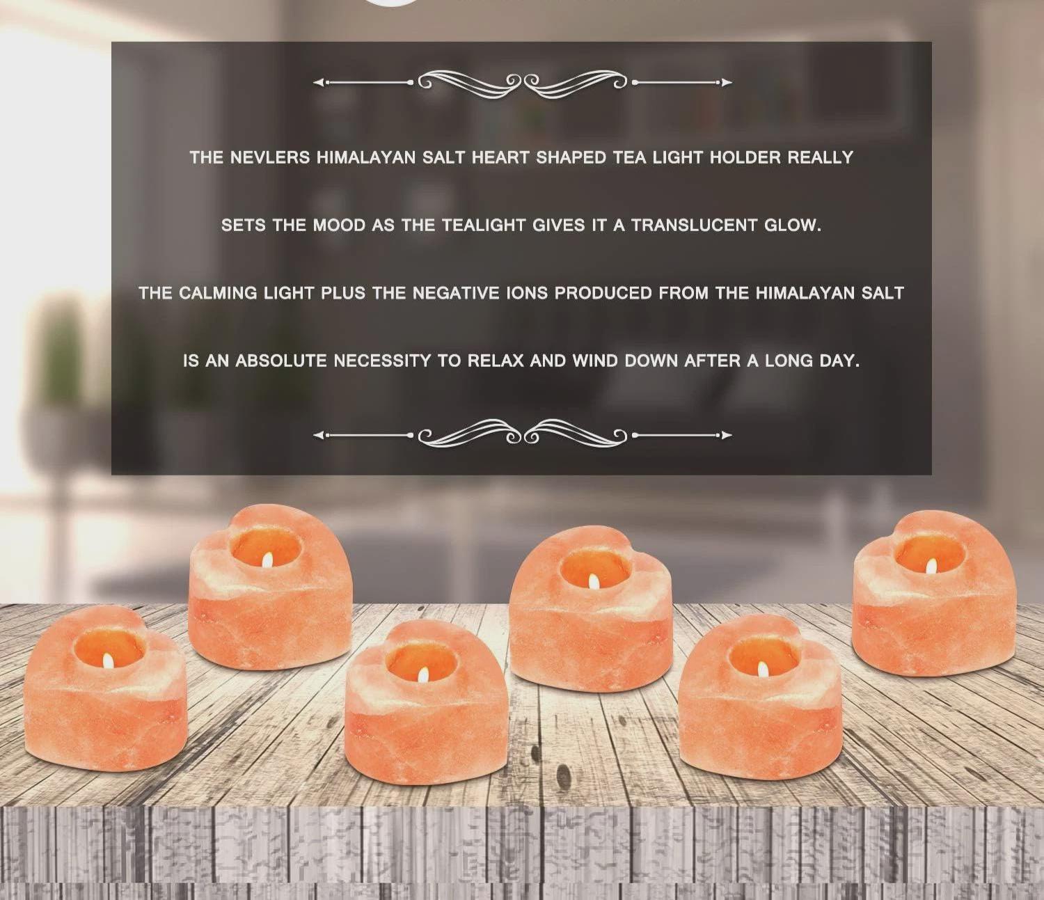 Bring a touch of romance and serenity to any space with this beautiful set of six heart-shaped Himalayan salt candle holders. Hand-carved from pure, ethically sourced salt crystals, these holders emit a soft, amber glow that creates a warm and inviting atmosphere.