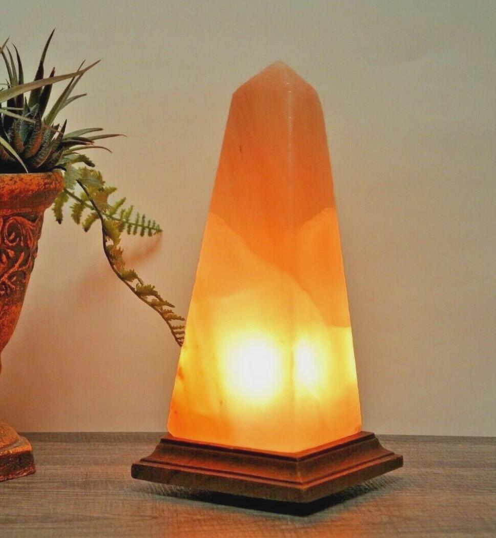 Hand-carved from pure Himalayan salt, this striking obelisk-shaped lamp radiates a warm, soothing glow that enhances any room’s ambiance. Its natural crystal structure is believed to help purify the air, reduce stress, and promote restful sleep—making it a perfect companion for bedrooms, meditation spaces, or cozy reading nooks.
