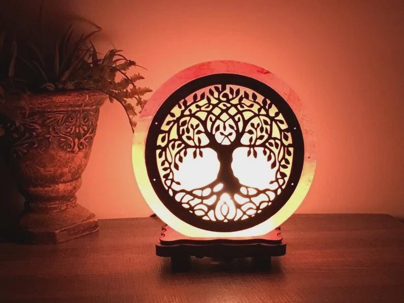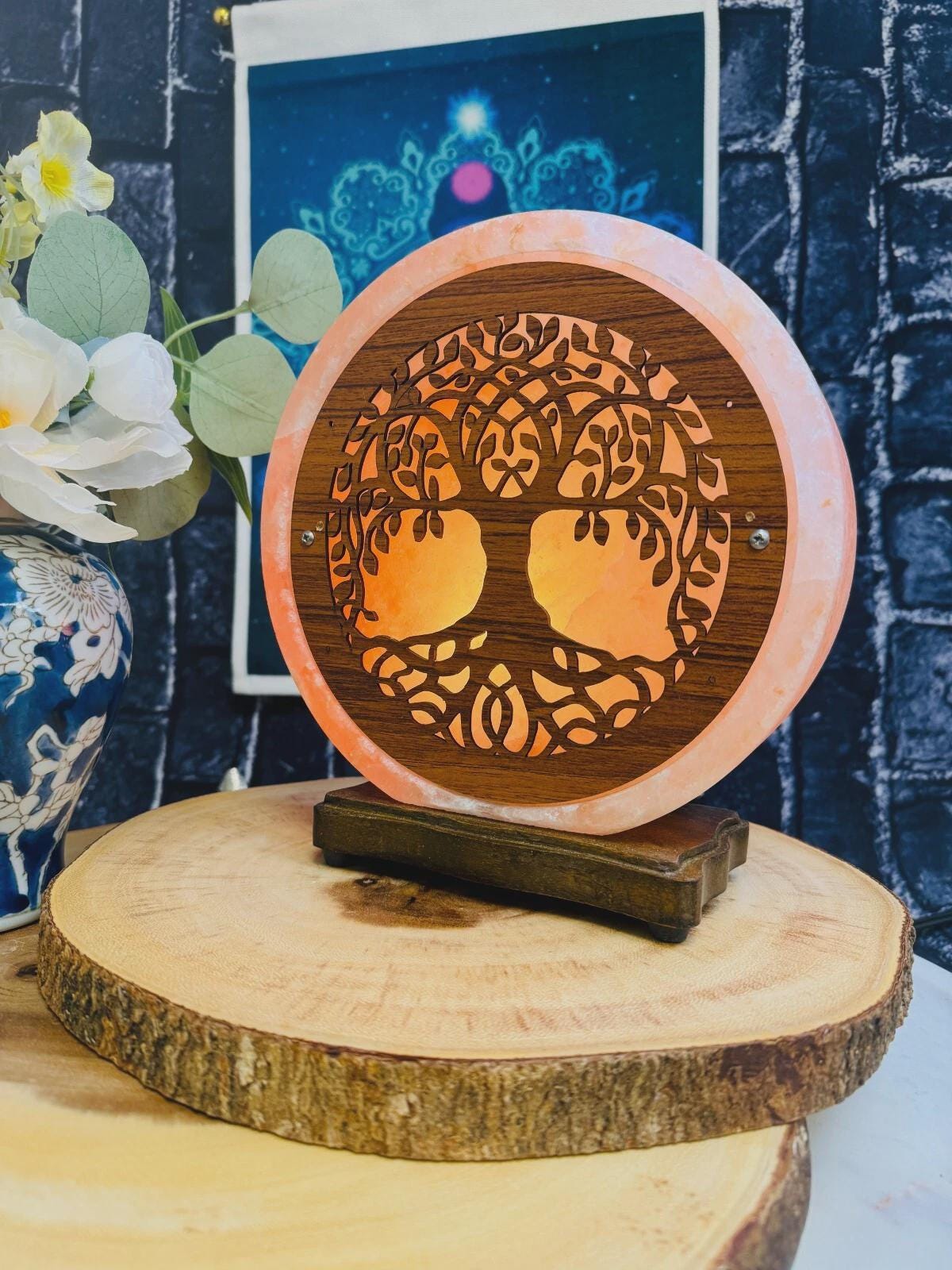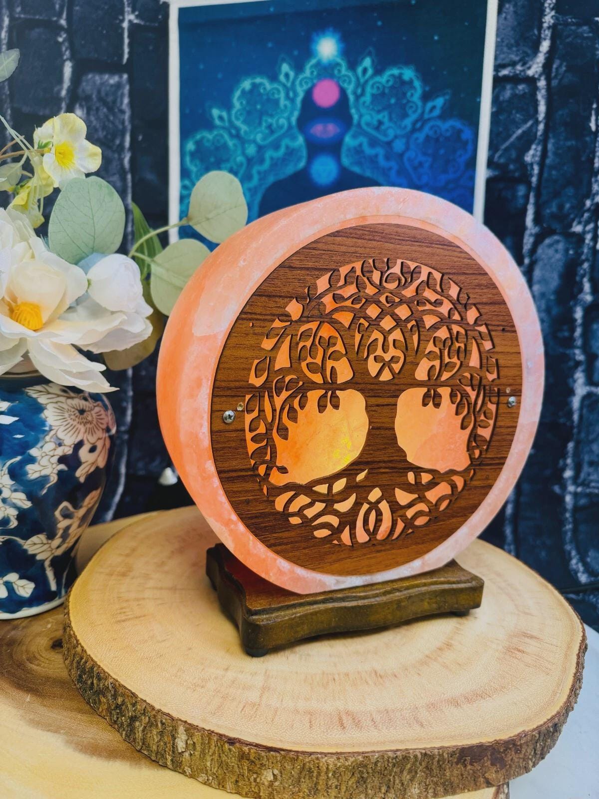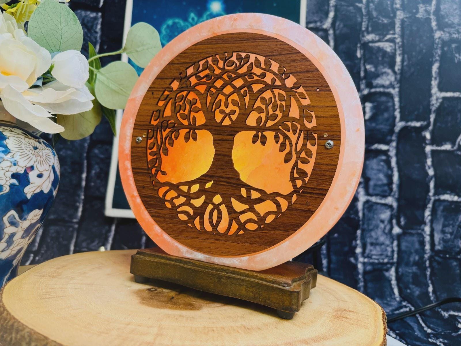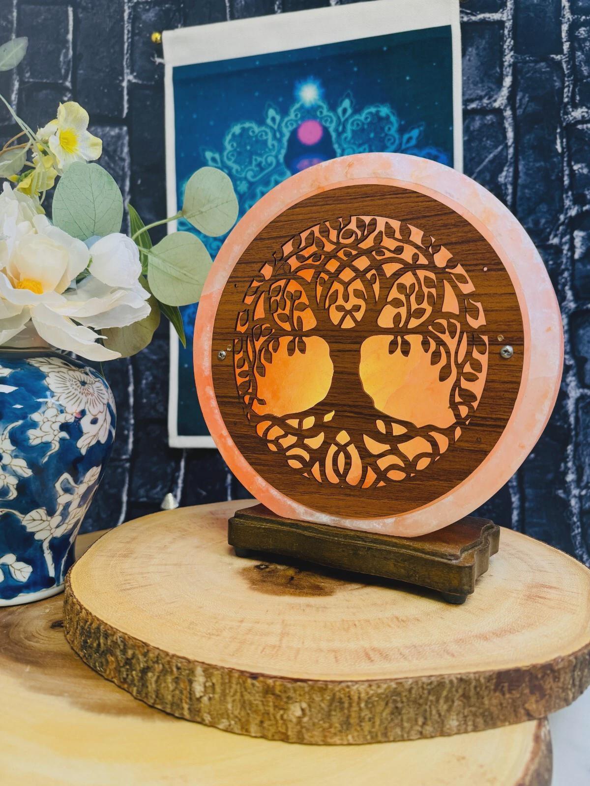 Himalayan Salt Lamp | Flower of Life Wood Carving | Dimmable Ambient Light