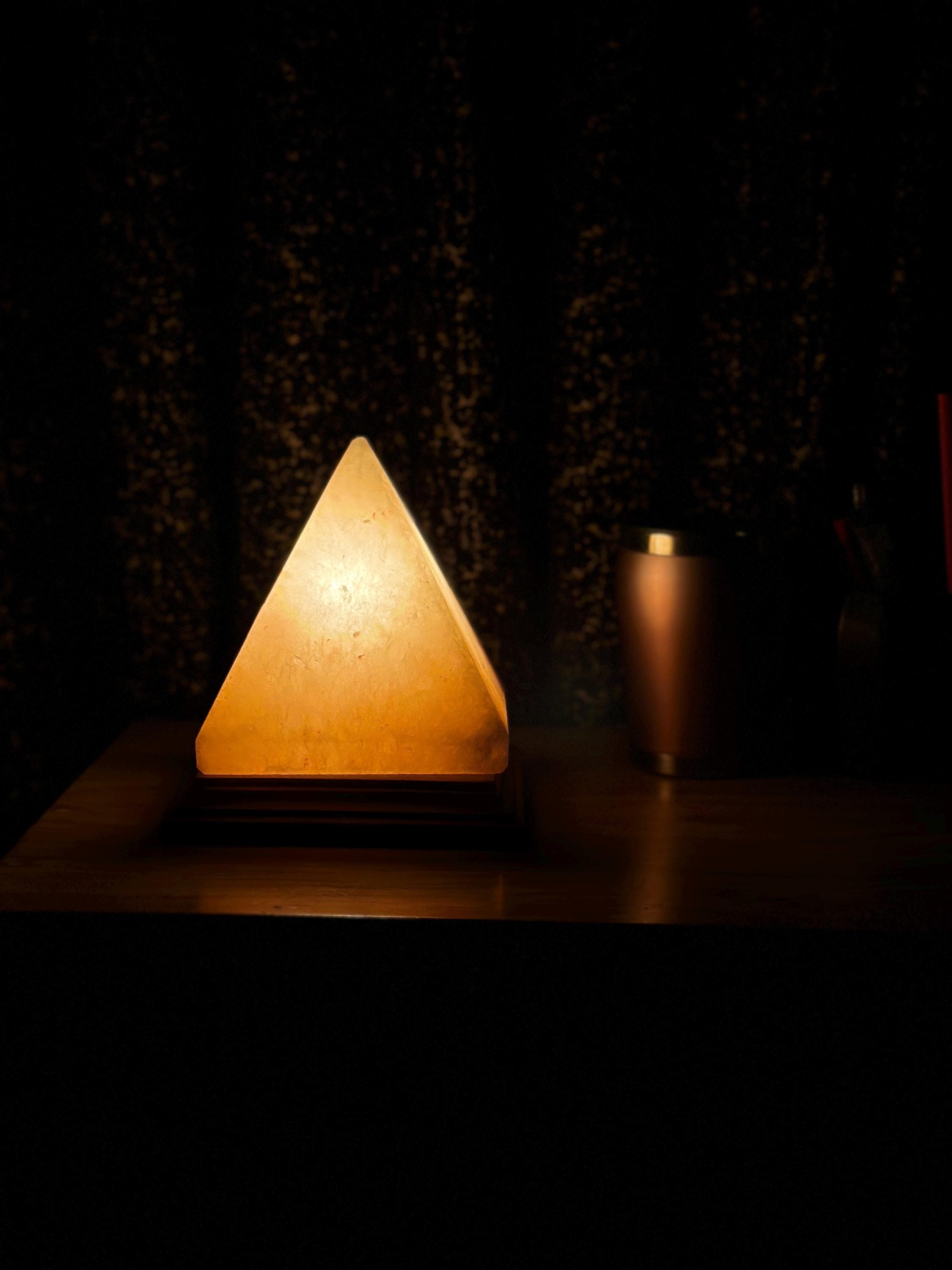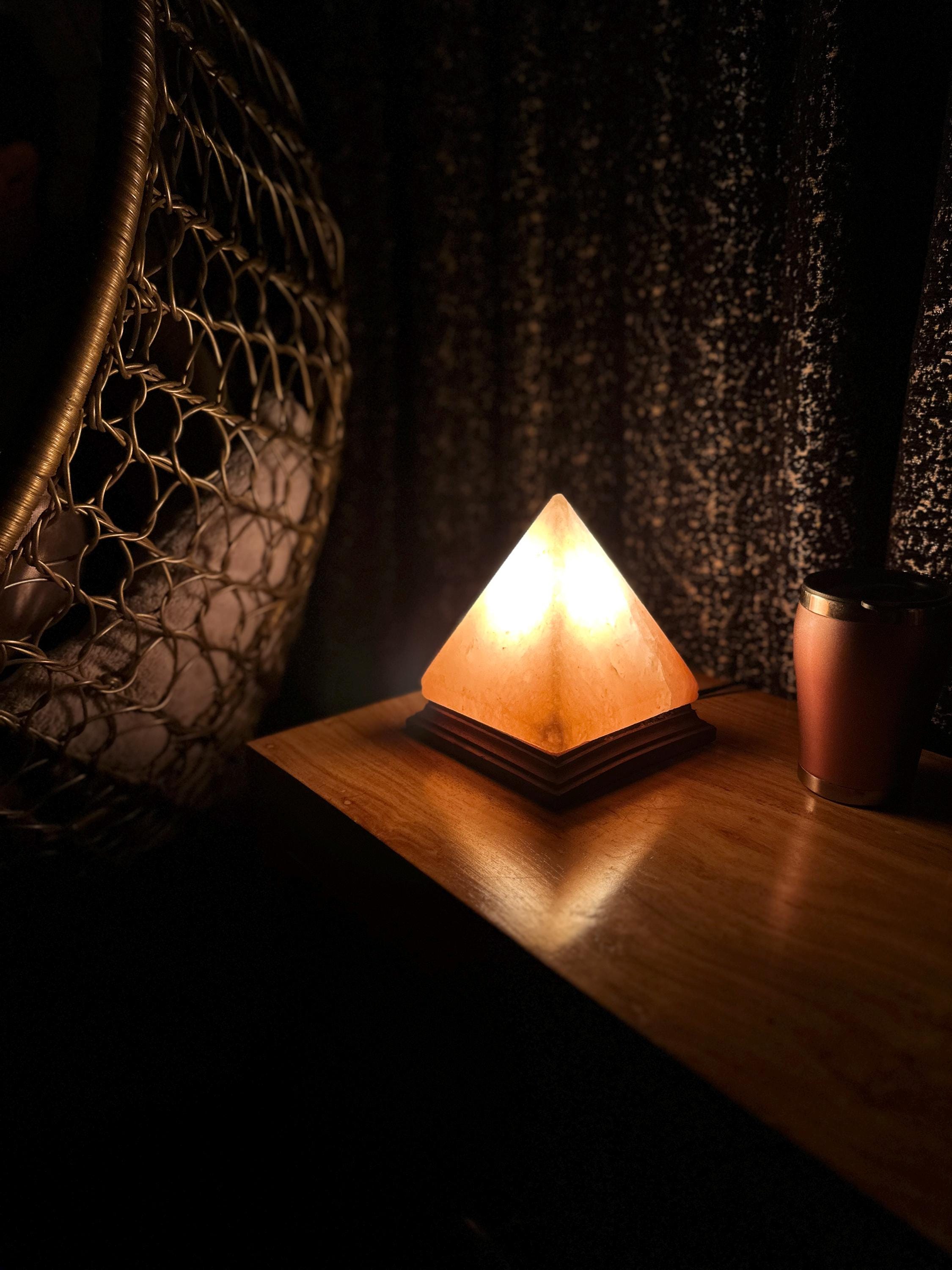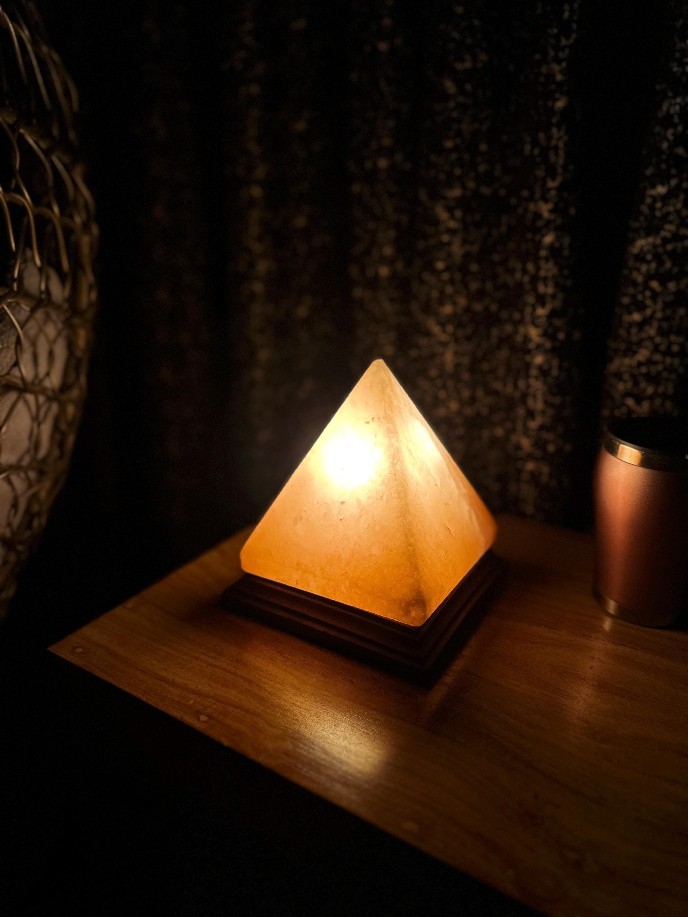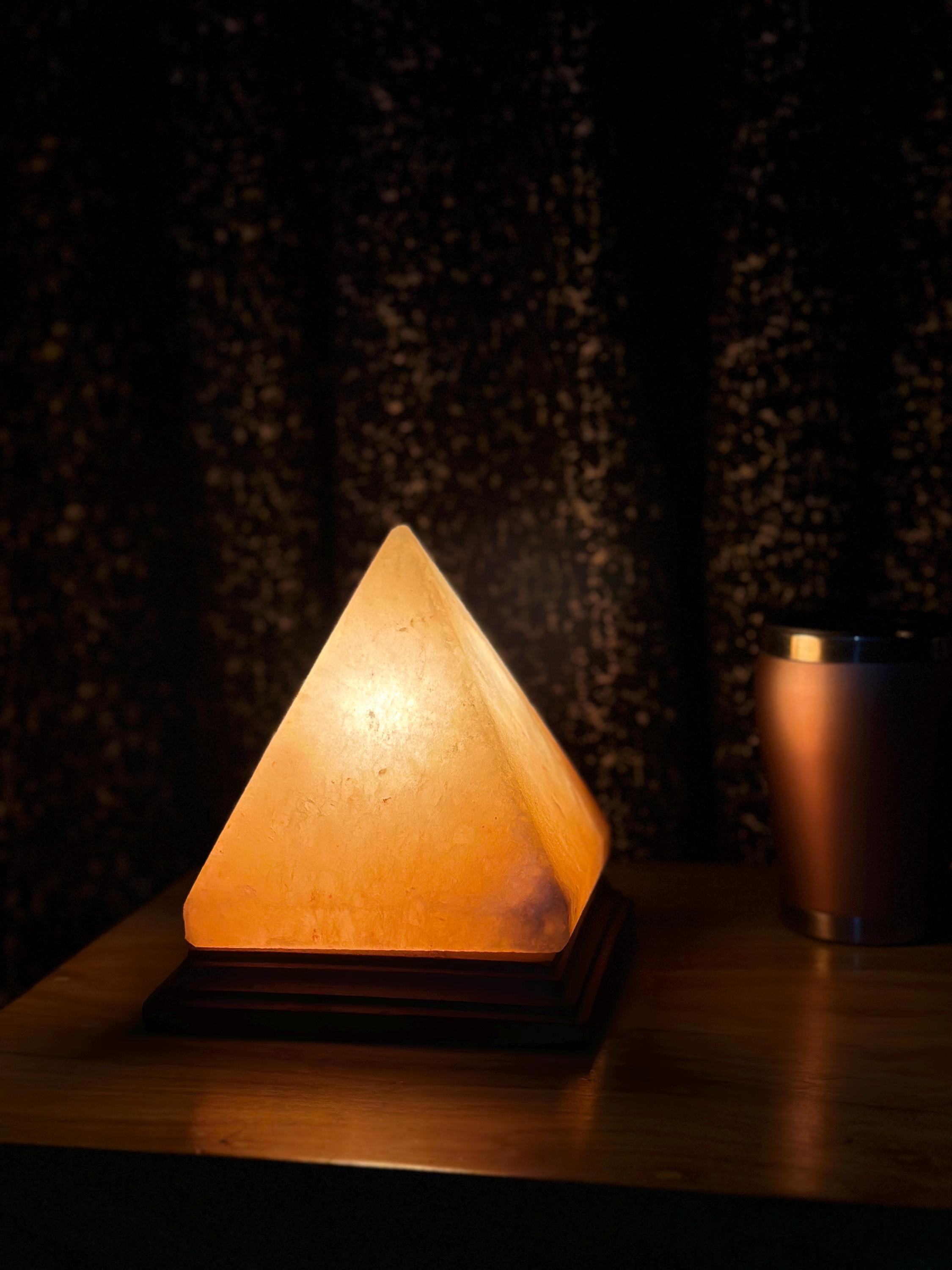 Illuminate your space with the geometric beauty of this Pyramid Himalayan Salt Lamp. Carved from genuine Himalayan salt crystal, this unique piece brings a spiritual and grounding element to any room.