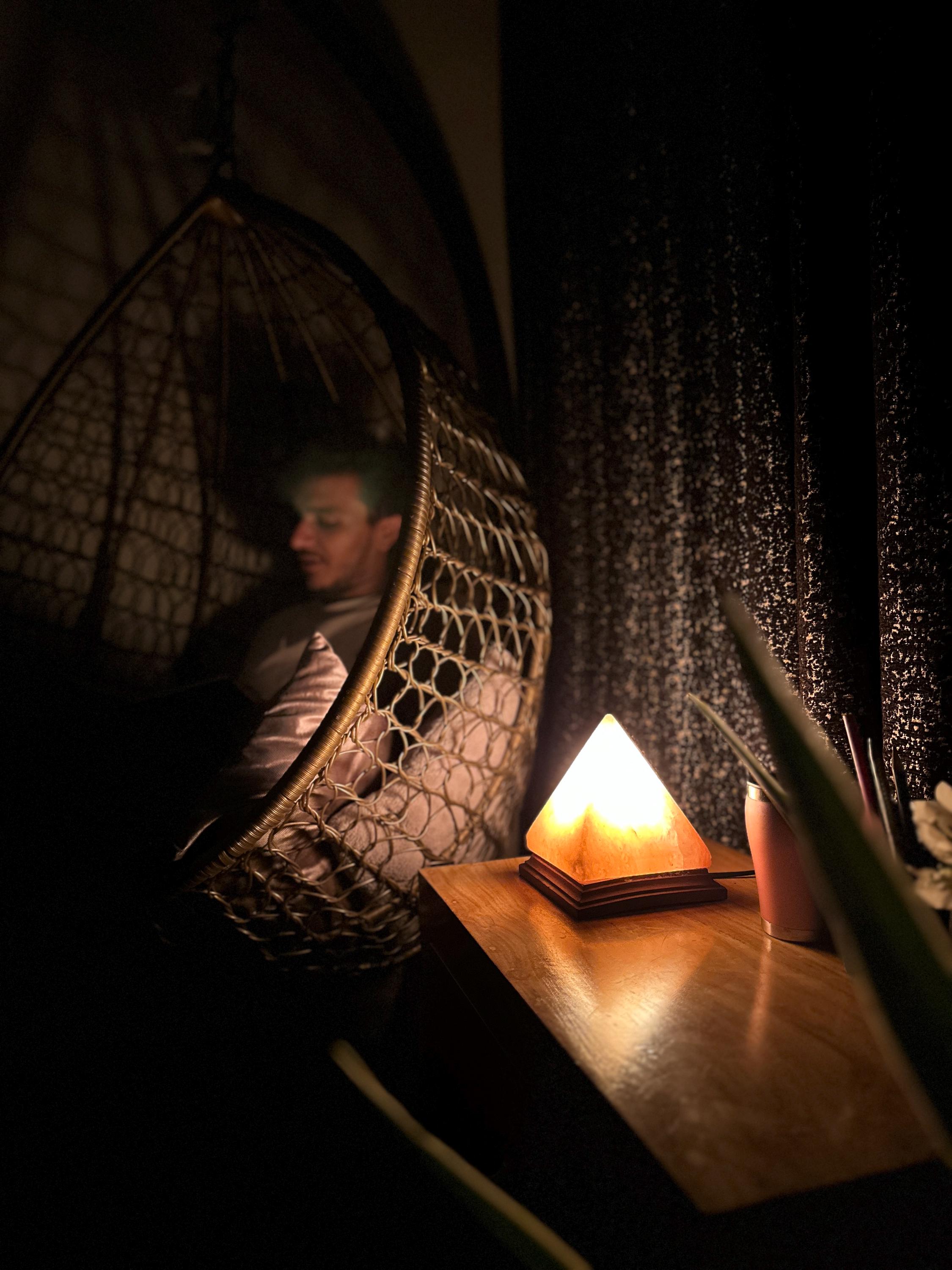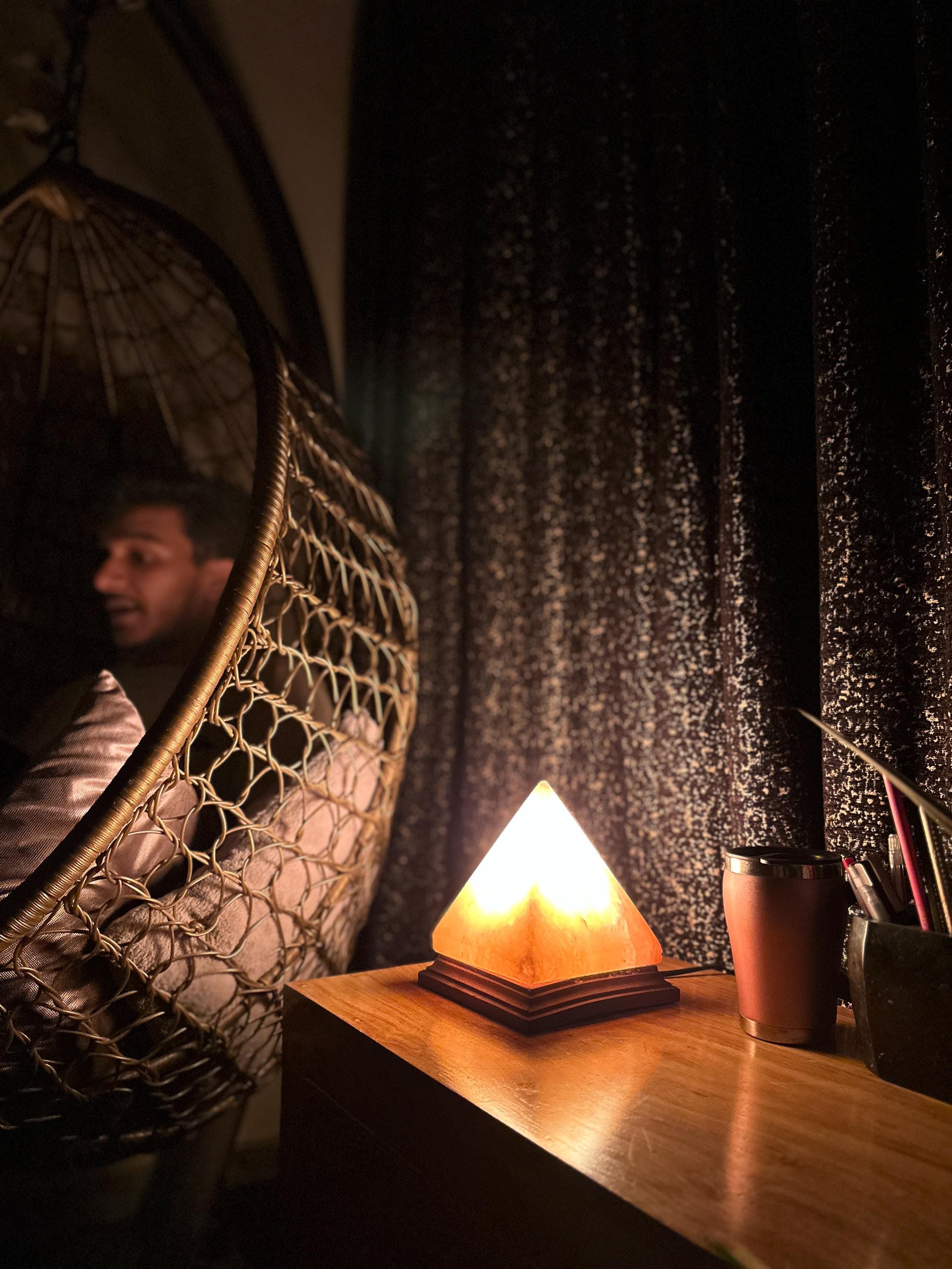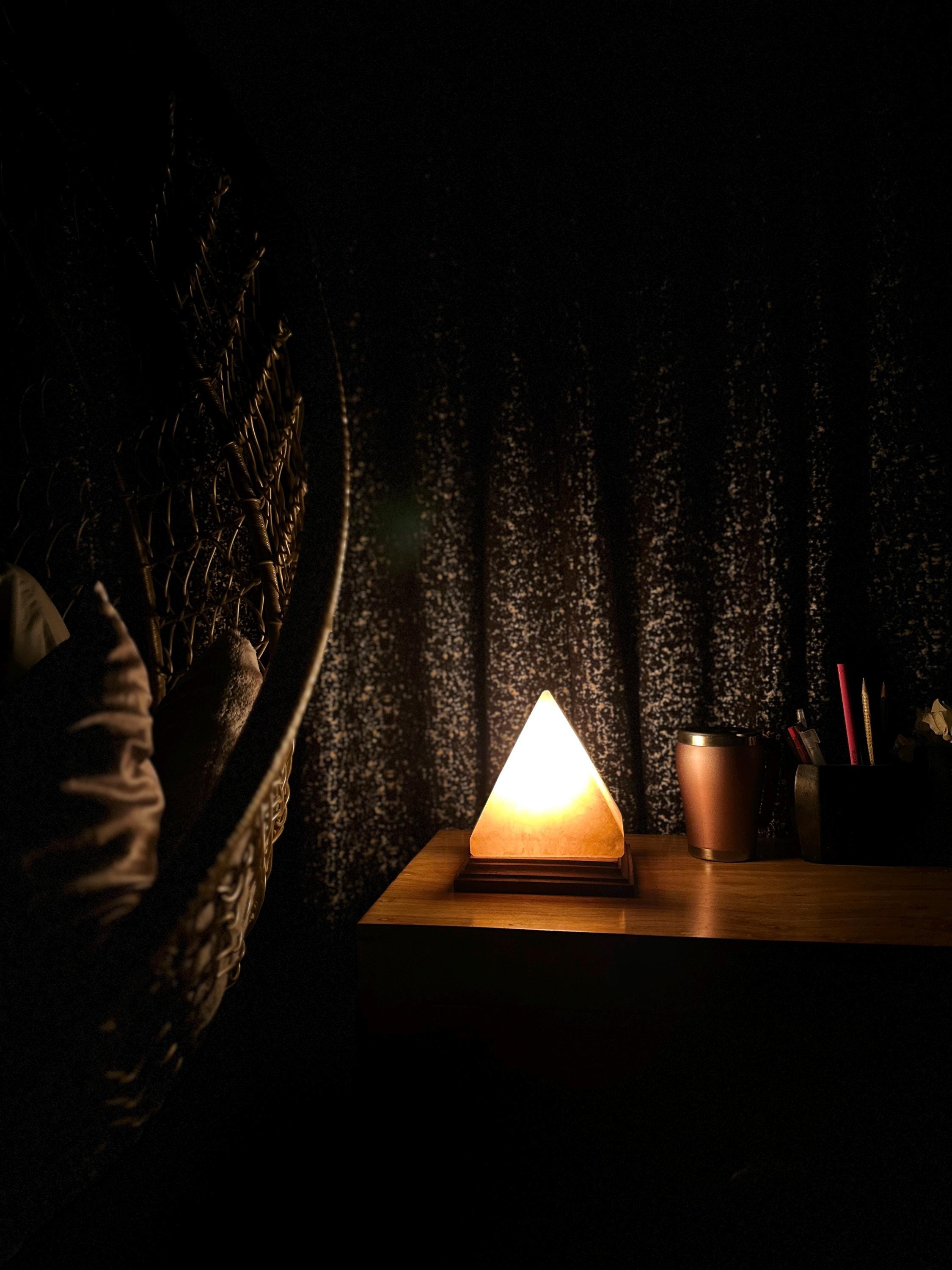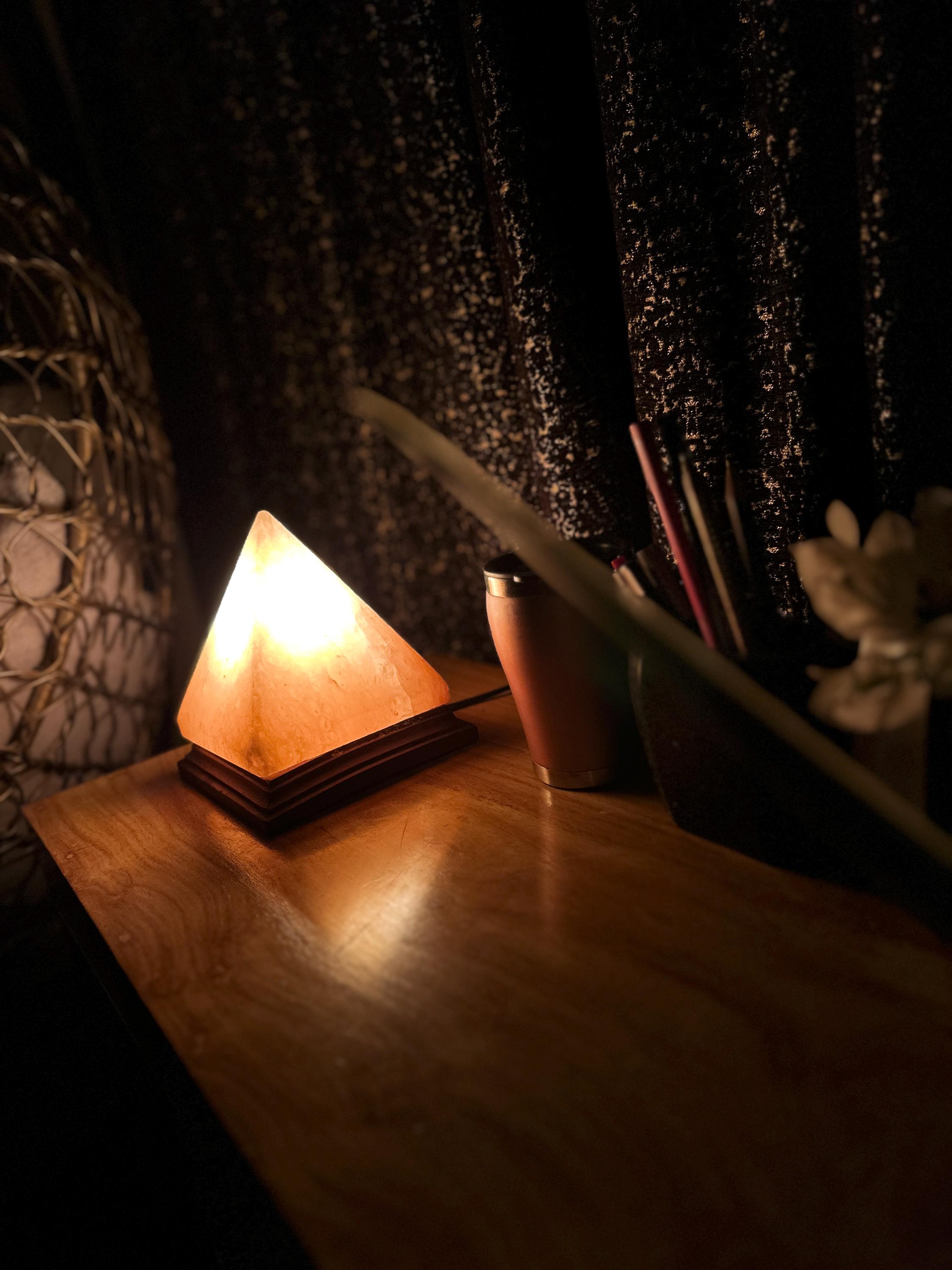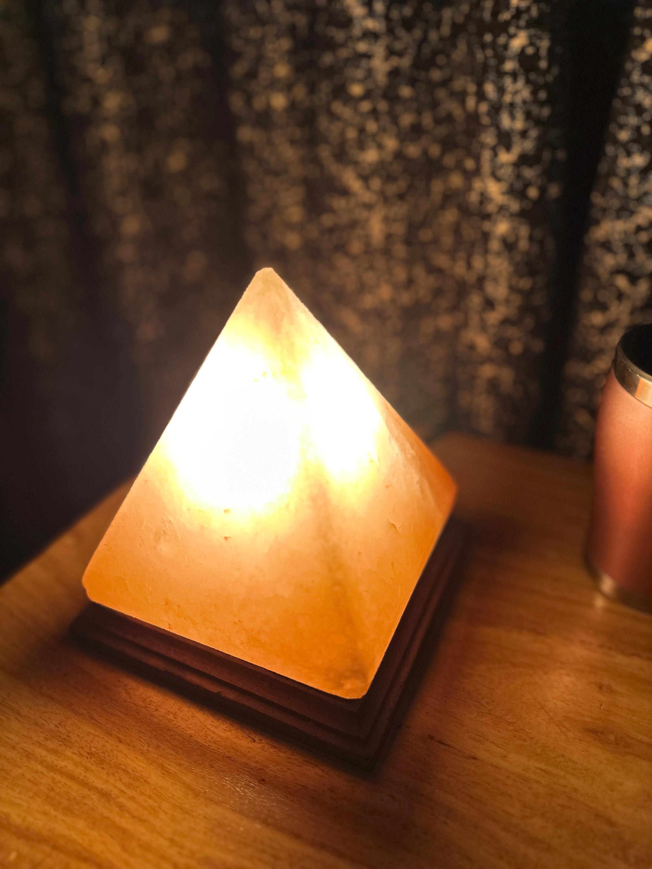 Illuminate your space with the geometric beauty of this Pyramid Himalayan Salt Lamp. Carved from genuine Himalayan salt crystal, this unique piece brings a spiritual and grounding element to any room.