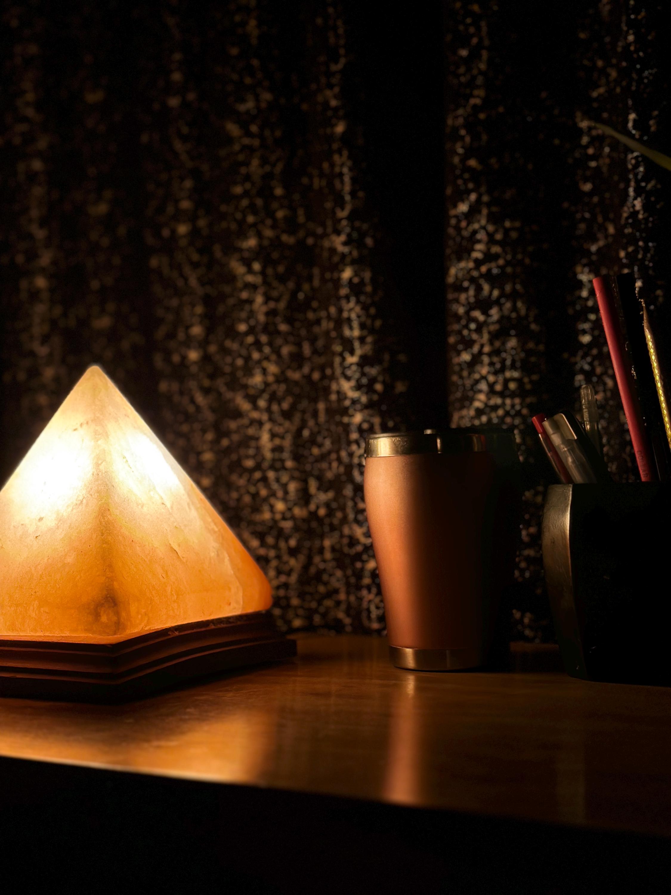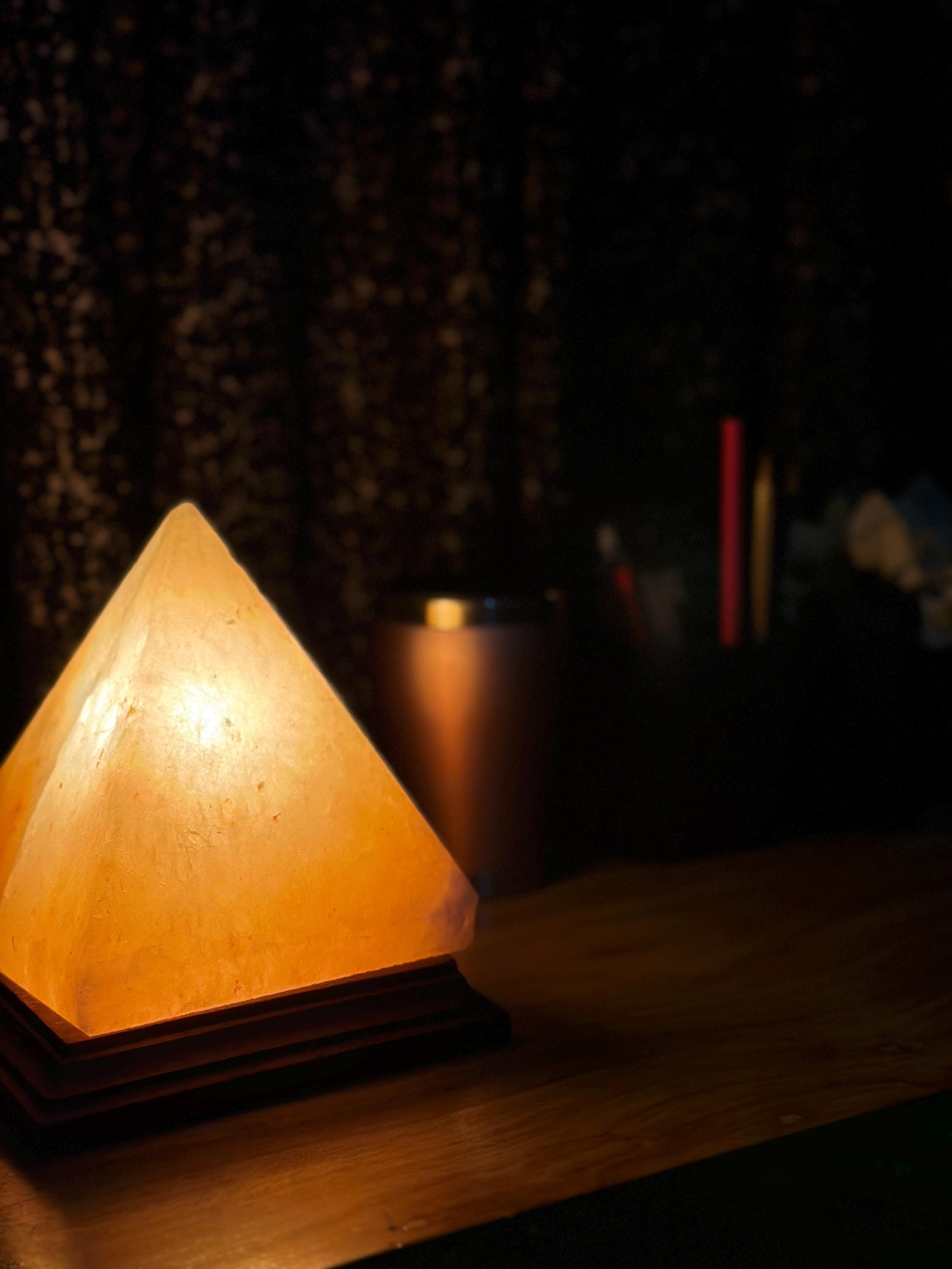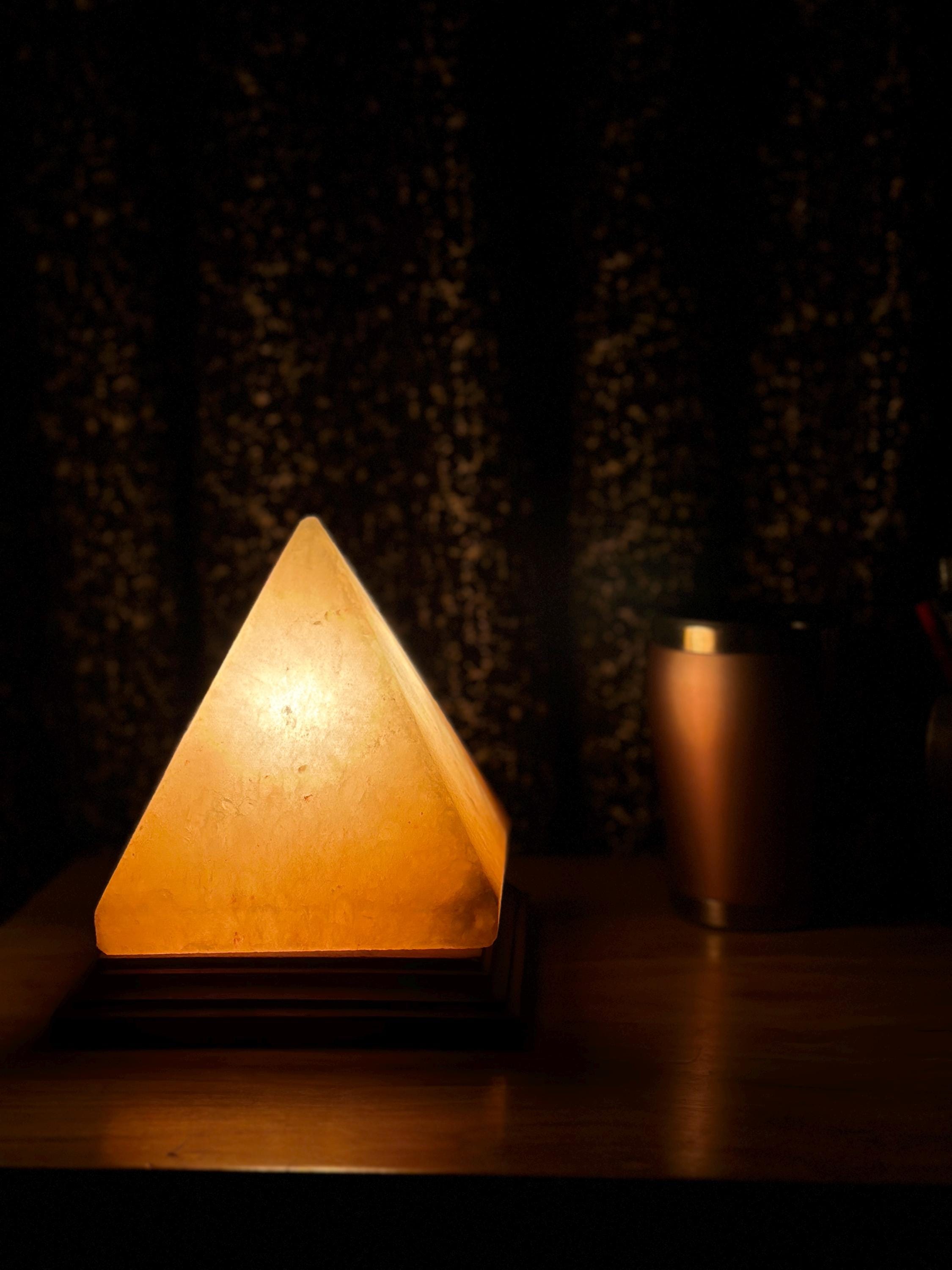 When lit, the lamp emits a rich, warm amber glow that is both captivating and incredibly relaxing, creating a peaceful sanctuary in your home. The striking pyramid shape sits atop a sturdy base, making it a distinct and elegant décor item. Perfect for those who appreciate natural crystals and powerful geometric forms.