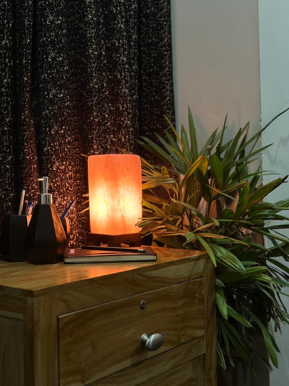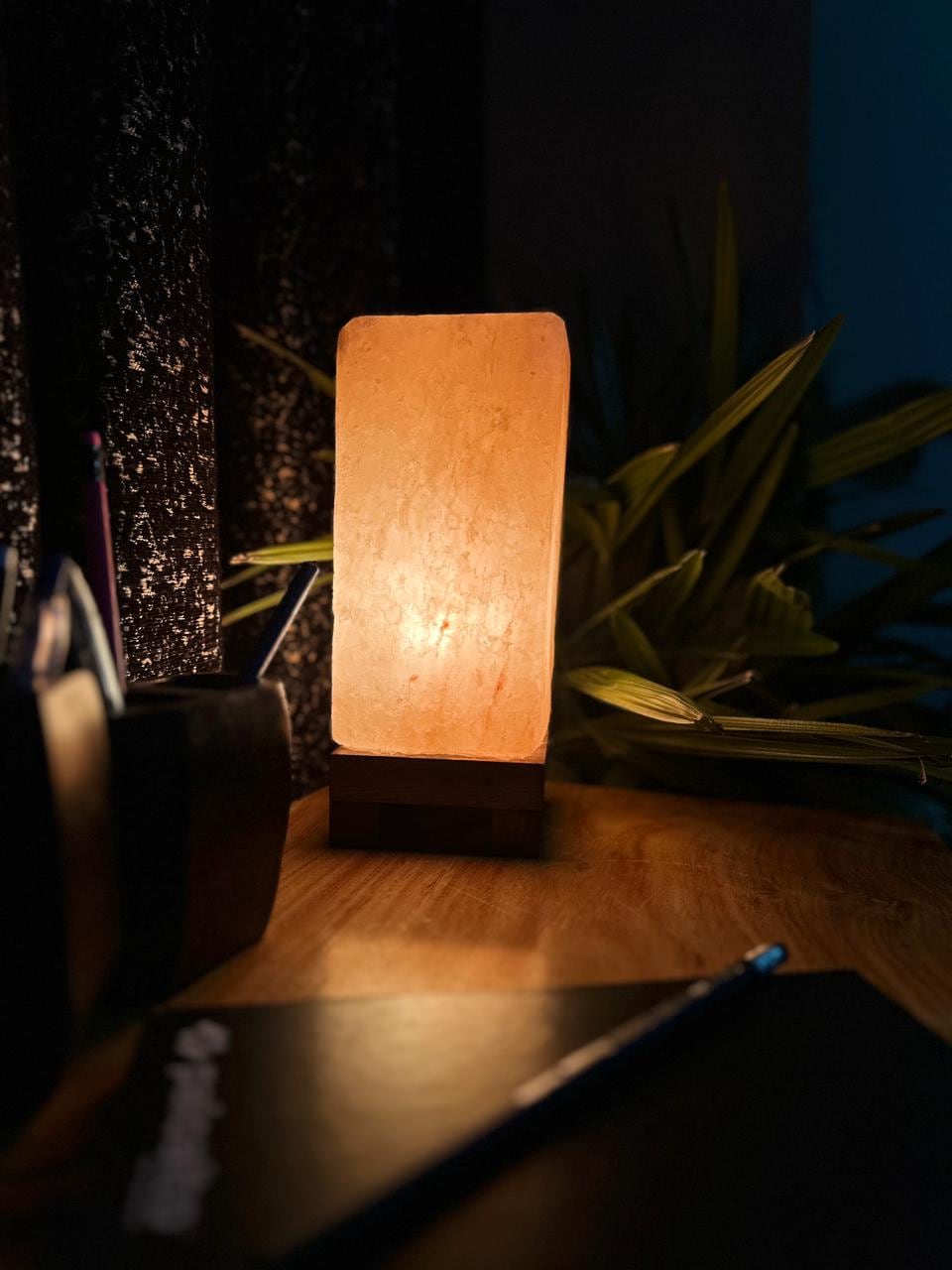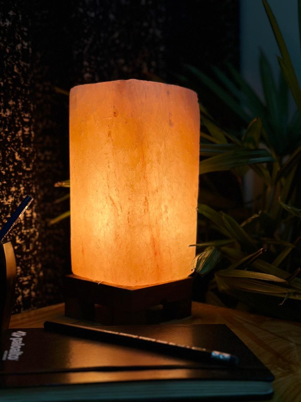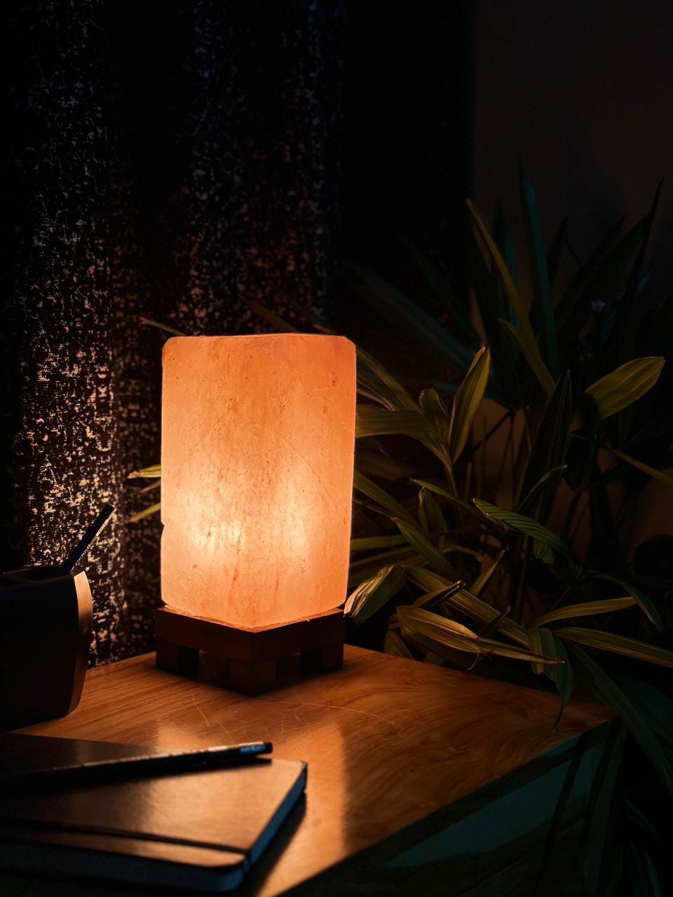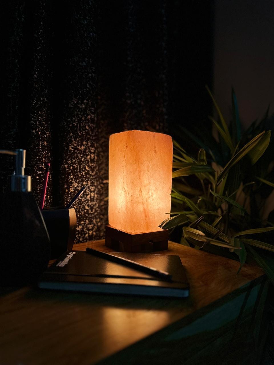 A natural, hand-carved Himalayan salt lamp casting a warm, ambient orange glow on a dark wooden base. It sits on a bedside table next to a notebook and pencil, creating a calming, cozy atmosphere perfect for relaxation or as a decorative piece .