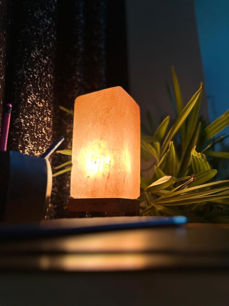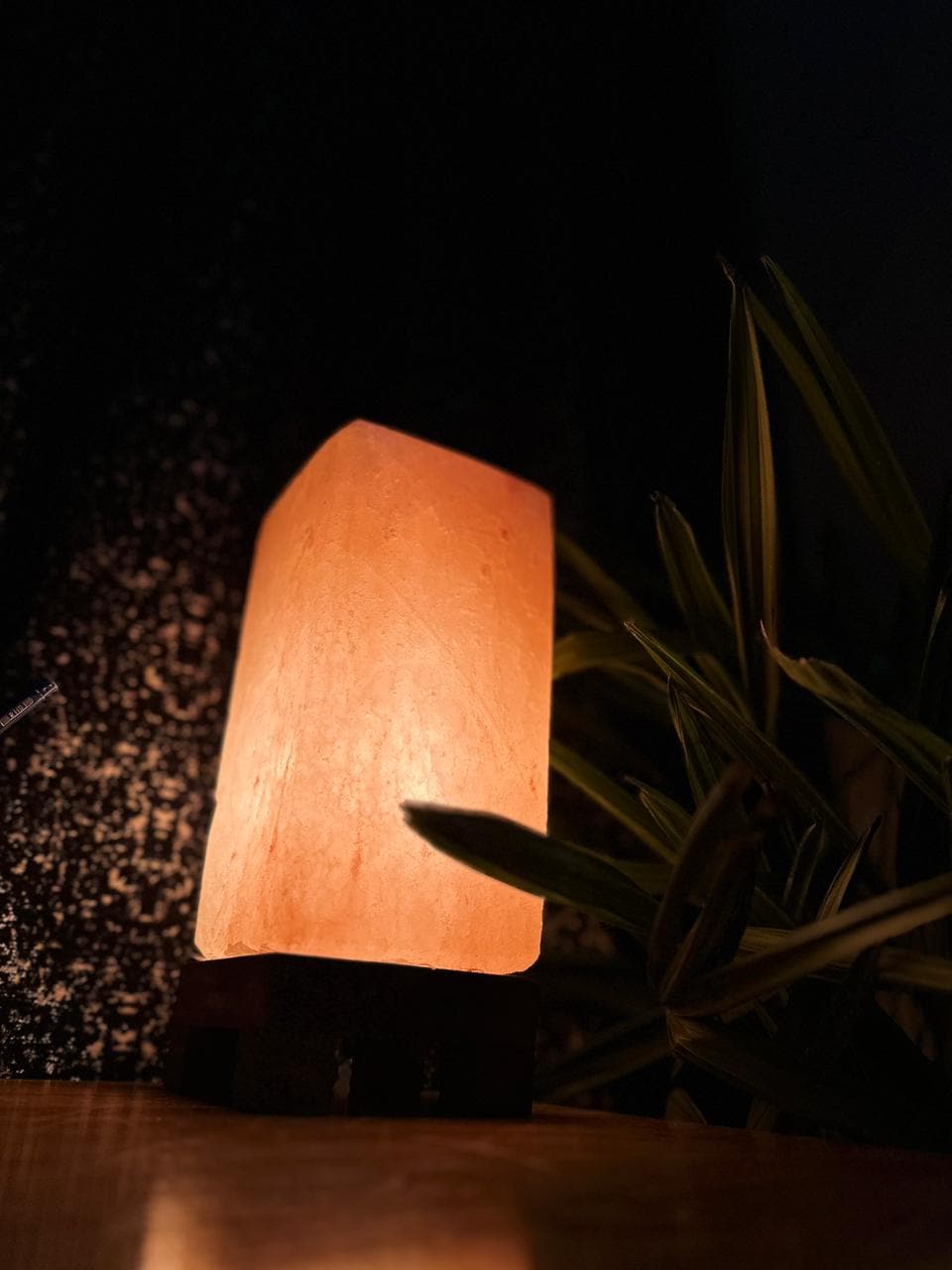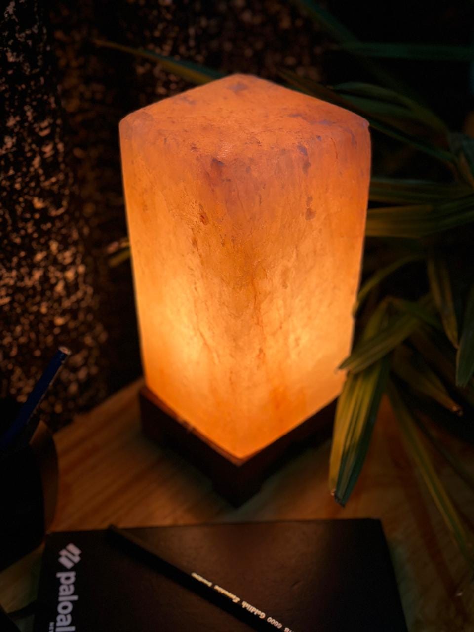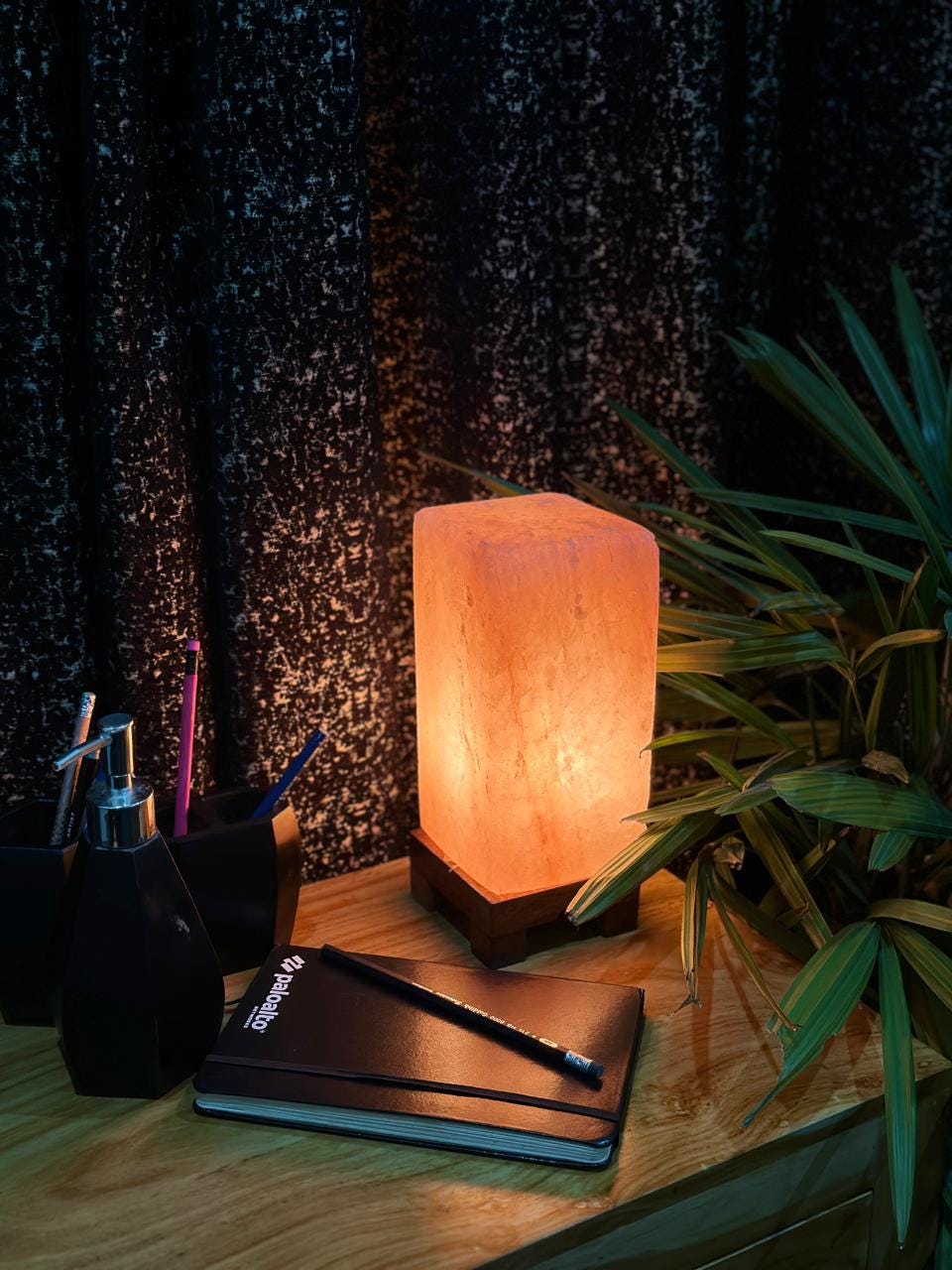 A natural, hand-carved Himalayan salt lamp casting a warm, ambient orange glow on a dark wooden base. It sits on a bedside table next to a notebook and pencil, creating a calming, cozy atmosphere perfect for relaxation or as a decorative piece .