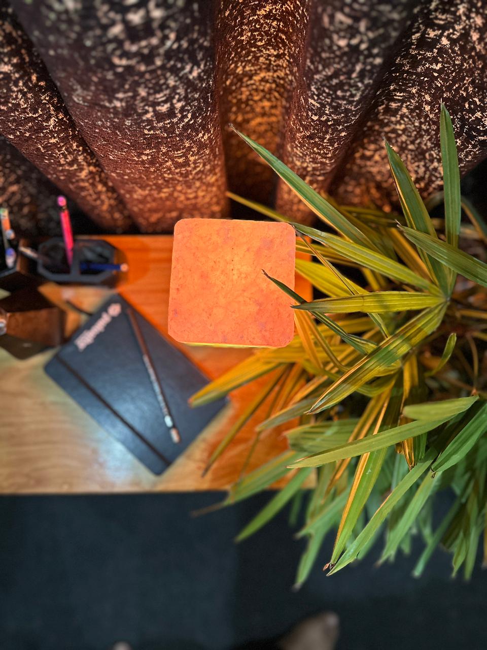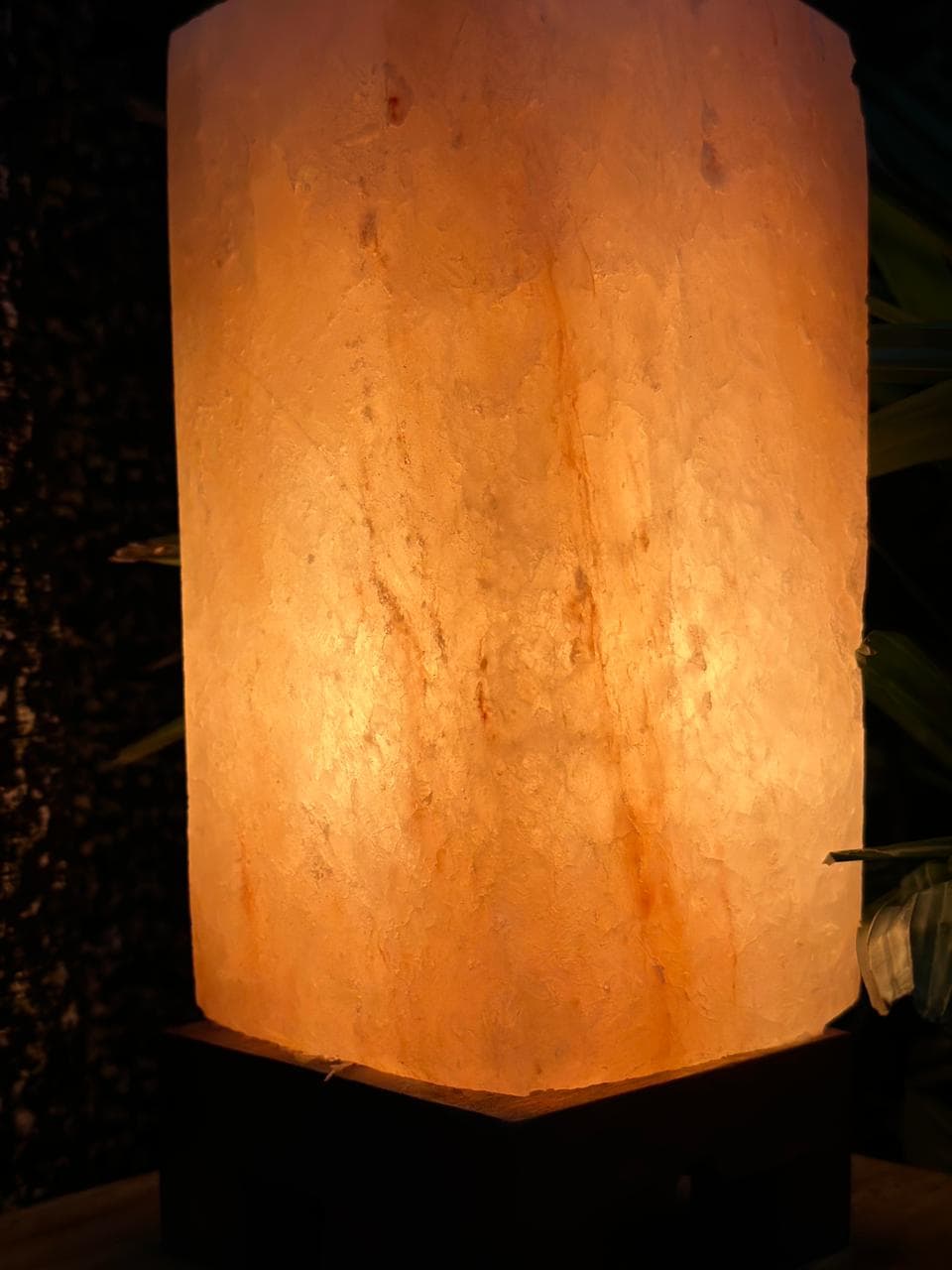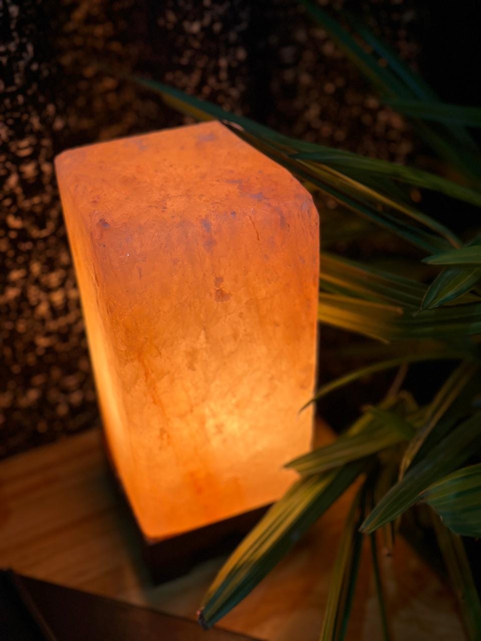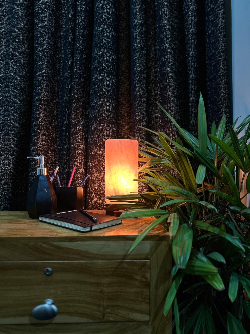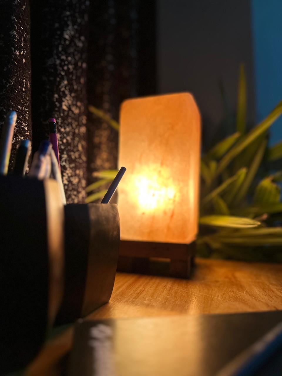 A natural, hand-carved Himalayan salt lamp casting a warm, ambient orange glow on a dark wooden base. It sits on a bedside table next to a notebook and pencil, creating a calming, cozy atmosphere perfect for relaxation or as a decorative piece .